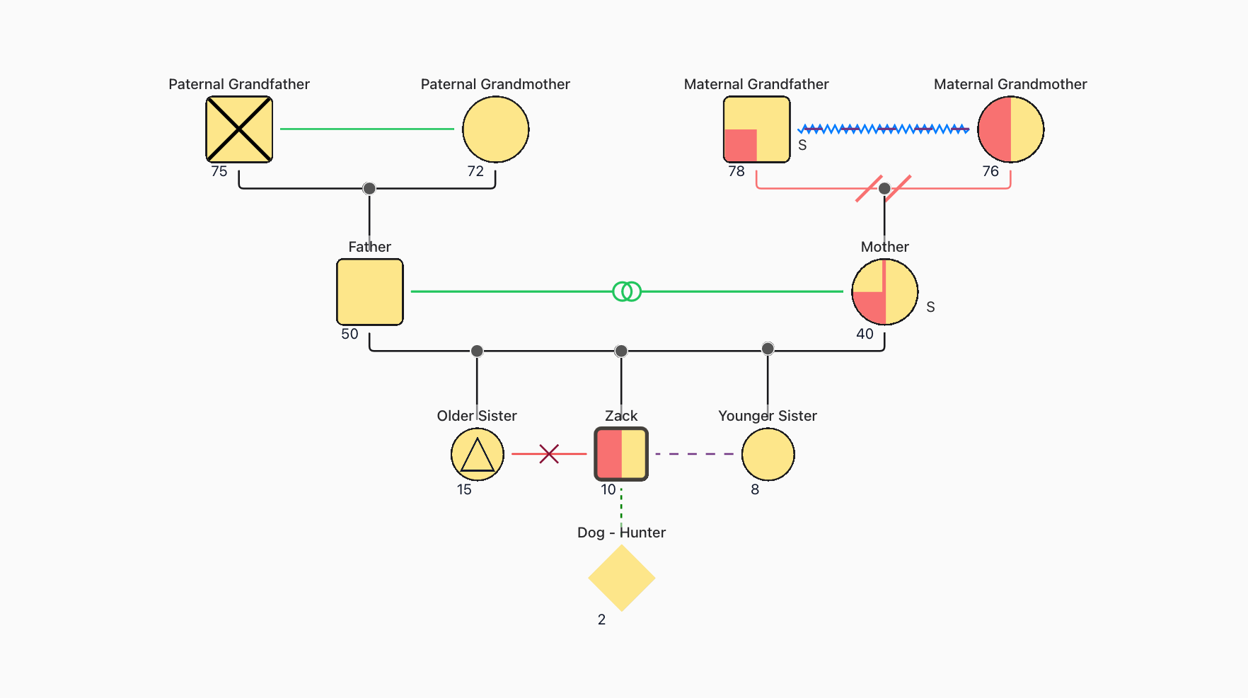 In this genogram, the thick black border around Zack’s node marks him as the main subject. His node is half‑filled in red to show he’s experiencing anxiety and depression. Below Zack, Hunter the dog is linked to him with a dotted line - his parents brought Hunter in to support Zack’s mental health.