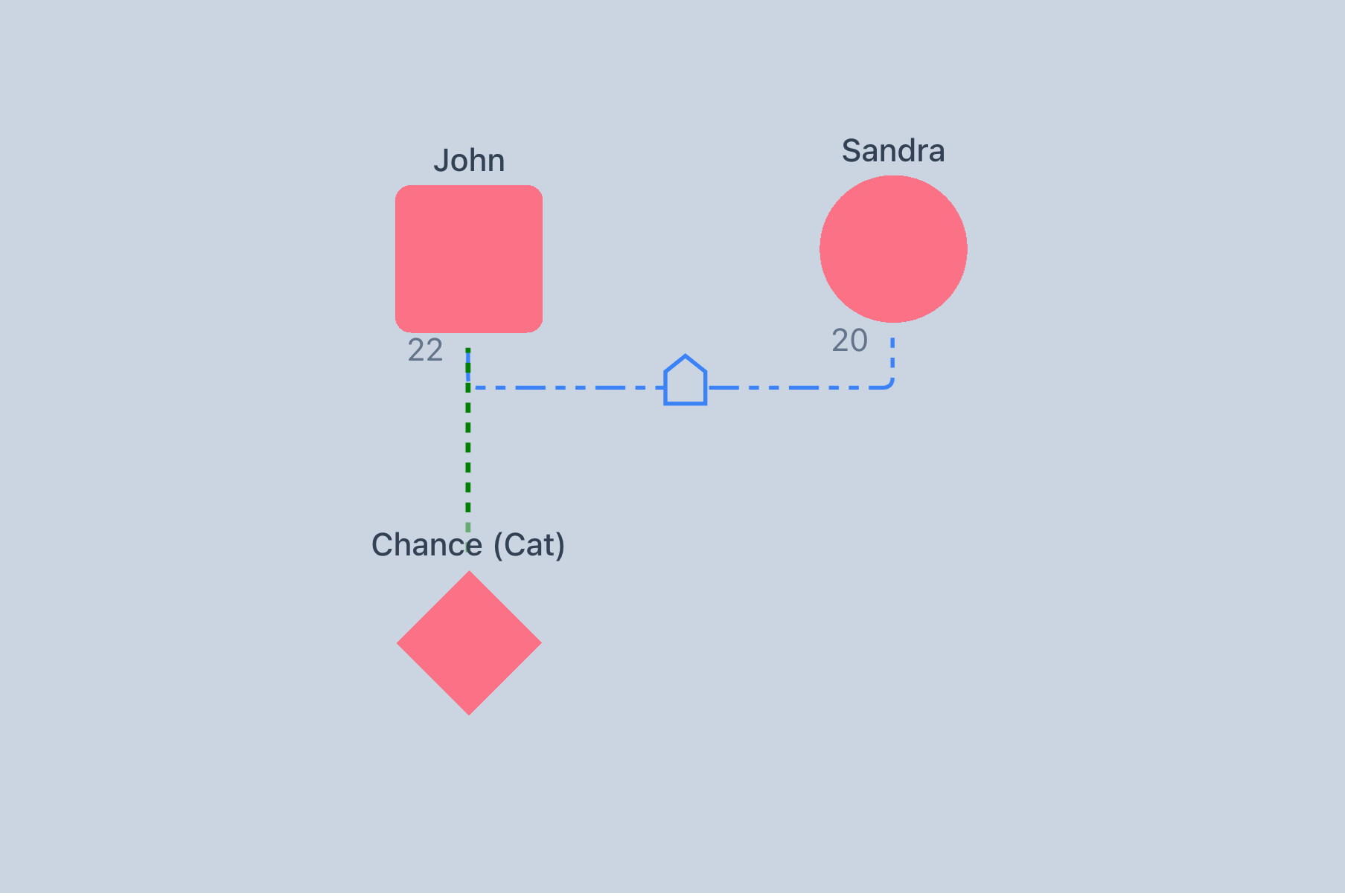 In the following example, Chance is John's cat, whom he adopted before meeting his partner Sandra. Although the couple are cohabiting and therefore live in the same house, John is Chance's primary caregiver and is therefore connected directly to him.